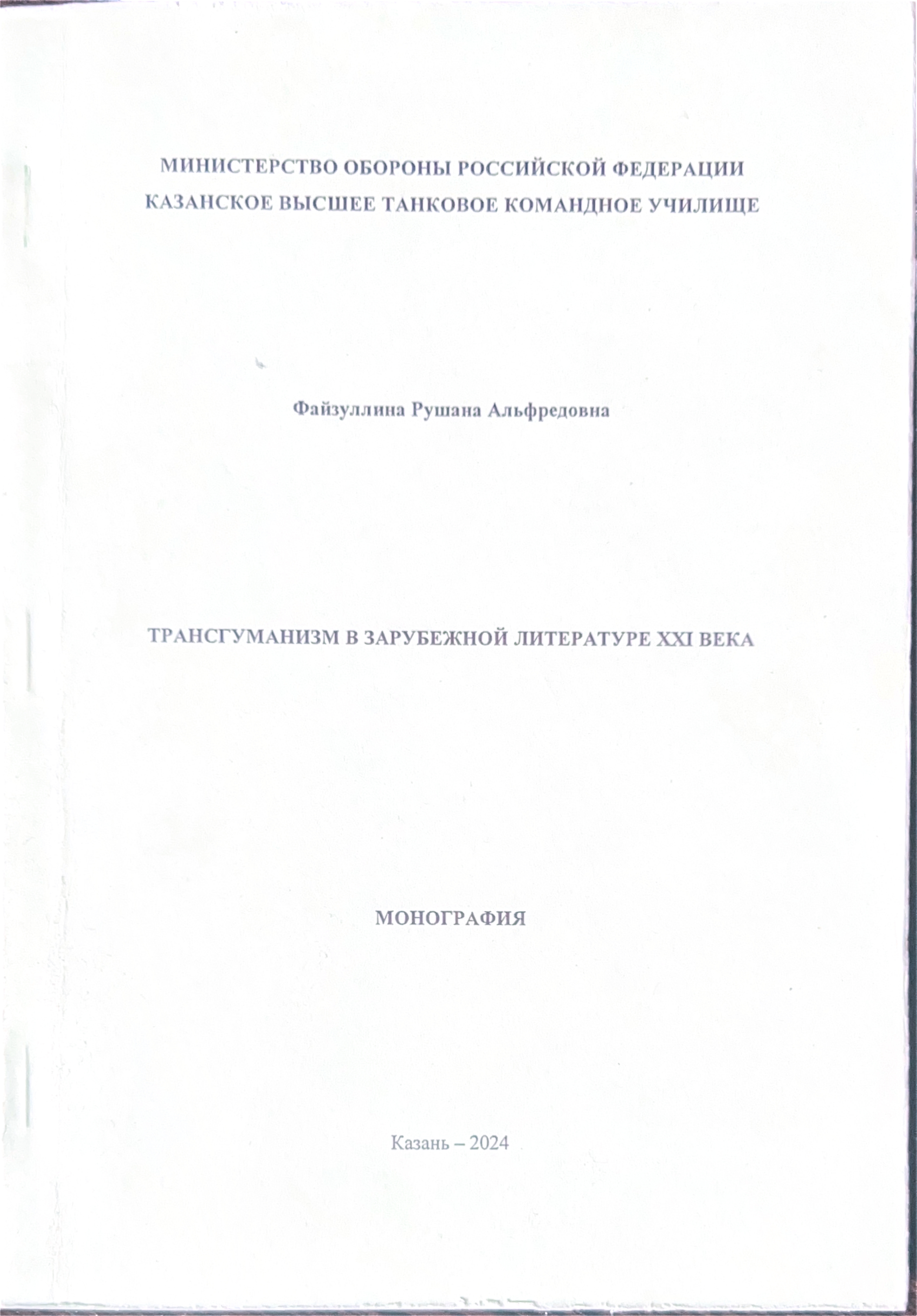Файзуллина Р.А. Трансгуманизм в зарубежной литературе XXI века / Р.А. Файзуллина. – Казань, Издательство Казанского ВТКУ, 2024. – 224 с. |